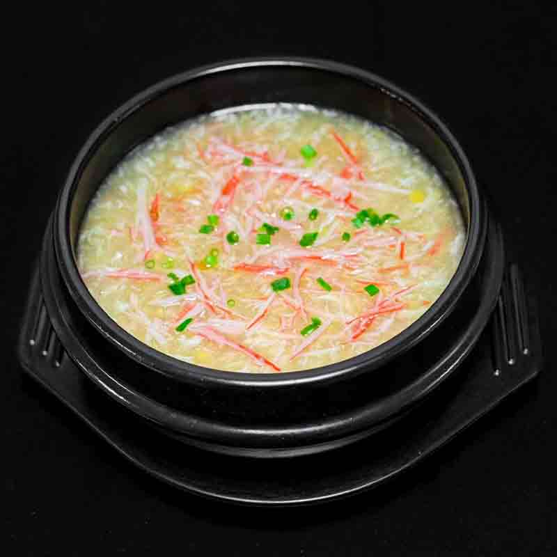 Soup with mashed sweet corn, crab meat and egg