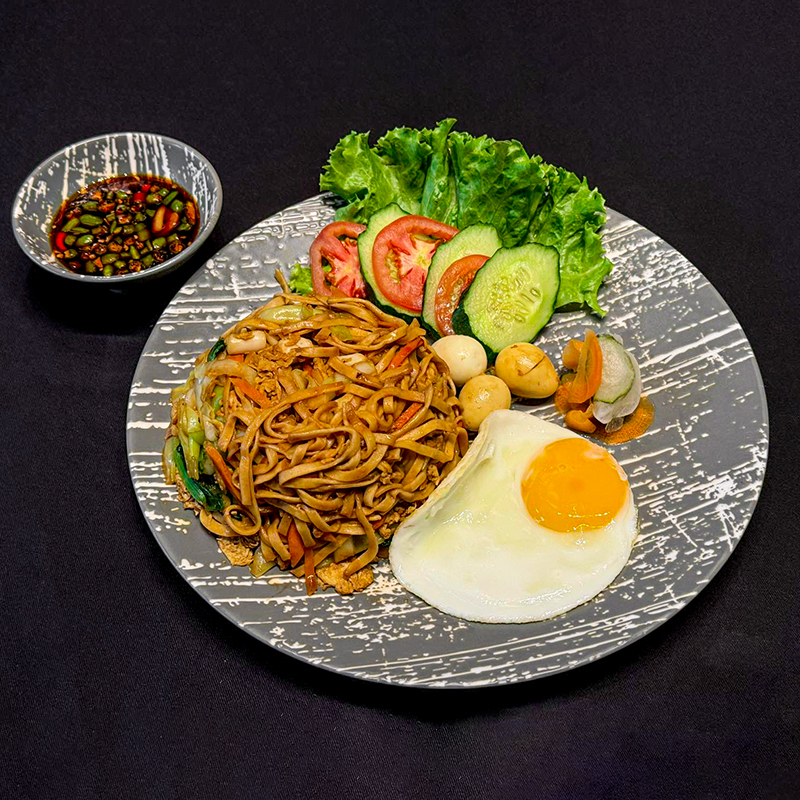 Wok Fried Egg Noodles with Quail Egg and Vegetables