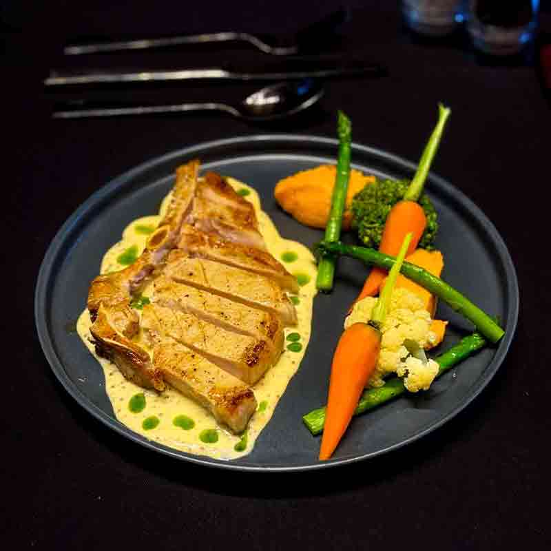 Pan Fried Pork Chop served with Butter Glazed Vegetables, Honey Sweet Potato and Mustard Cream Sauce.