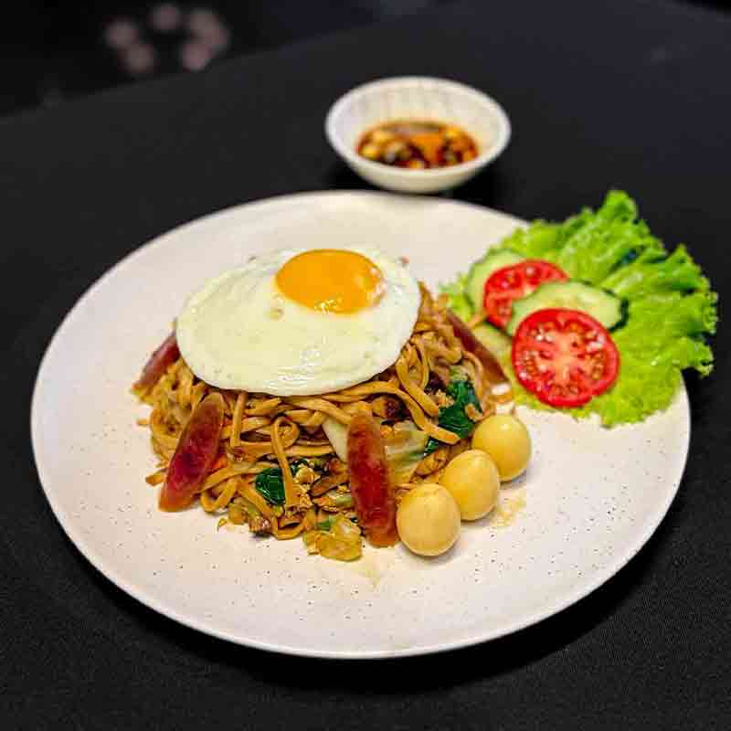 Wok Fried Egg Noodles with Quail Egg and Vegetables