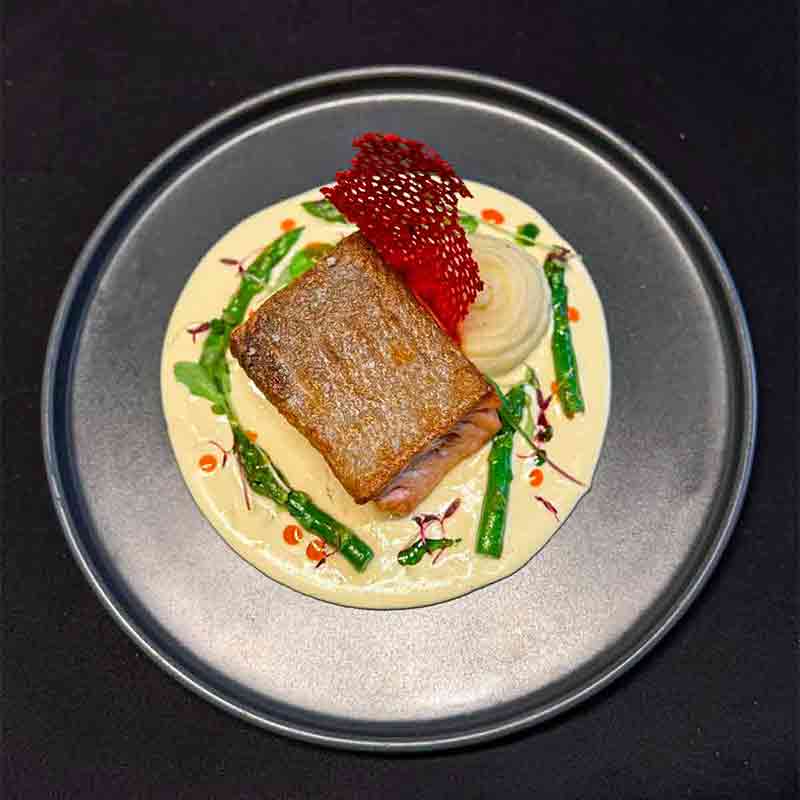 Pan-Fried Salmon Creamy Potatoes, Spring Vegetables and Lemon Butter Sauce.