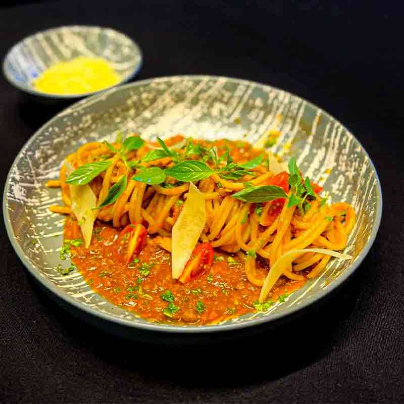 Slow Cooked Mince Meat Stew served with Spaghetti Pasta and Parmesan Cheese.