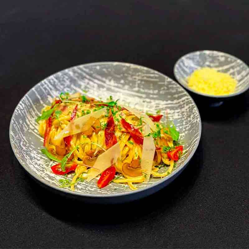 Pasta with in Creamy Egg Yolk, Bacon, Ham, Mushroom and Parmesan Cheese.