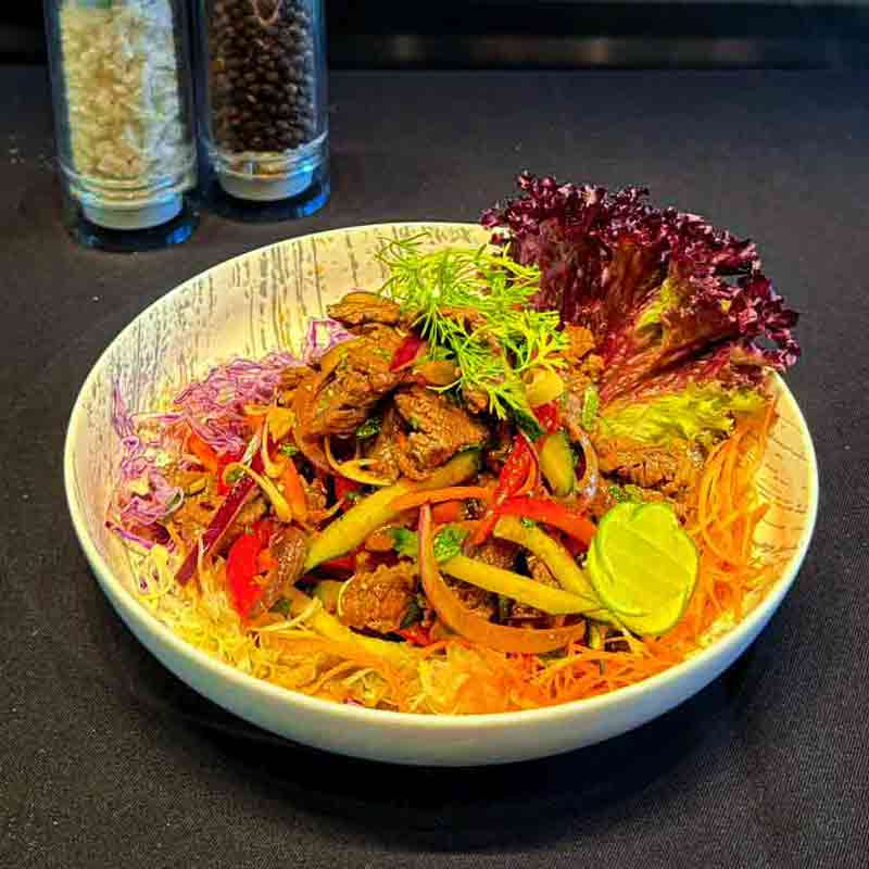 Slow Cooked Special Burma Beef, Roasted Rice -Crushed Chili Sauce, Purple Onion and Fresh Herbs.