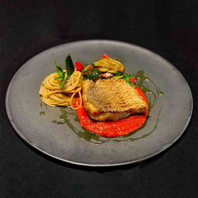 Local Grilled Seabass with Marinated Seafood-Tomato Sauces and Grilled Vegetables.