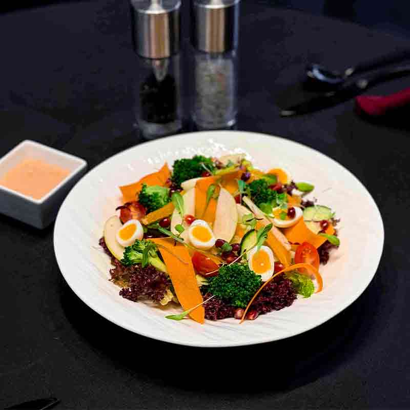 Verity of Lettuce from Greenhouse, Spring Vegetables, Scallion Quail Eggs served with Californian Mayonnaise